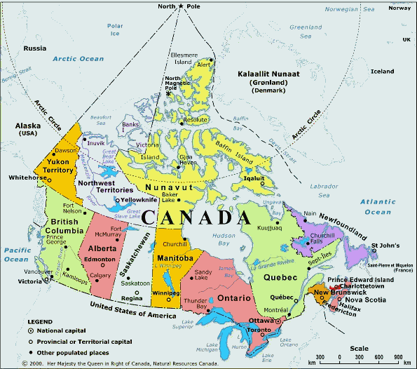 Канада умовно поділяється на Атлантичні провінції, Квебек, Онтаріо, провінції Прерій, Британську Колумбію та Північні території.